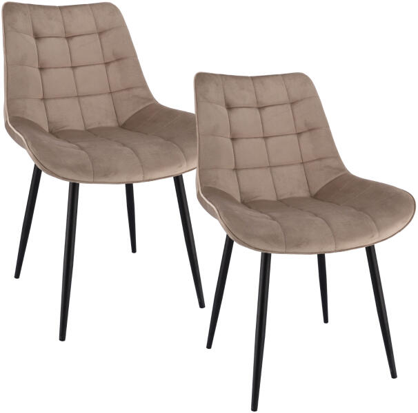 MISTY bézs színű, steppelt étkezőszék szett (2 db) ? A MISTY szék egy kis fotel kényelmét nyújtja, puha, steppelt ülőfelületével, mely körülöleli a testet. A bársonyos kárpit rendkívül elegáns megjelenést kölcsönöz, míg a magas, karcsú, fekete lábak stabilitást biztosítanak. Főbb jellemzők:Kényelmes ülőfelület: A puha, steppelt ülőrész maximális komfortot biztosít. Elegáns design: A bársonyos kárpit és a fekete lábak stílusos megjelenést kölcsönöznek. Stabilitás: A magas, karcsú fém lábak garantálják a szék stabilitását. Sokoldalúság: Tökéletes választás étkezőbe, nappaliba vagy akár dolgozószobába is. Termékleírás:Szín: Bézs Szett tartalma: 2 db szék Ülőfelület anyaga: Bársony (velúr) Lábak anyaga: Fém Maximális terhelhetőség: 130 kg Méretek:Méret Érték (cm)Teljes magasság 83Szélesség 53Mélység 63Ülésmagasság 42Ülésszélesség 53Ülésmélység 42Lábak közötti táv 39Fontos: A lábak megfelelő rögzítése elengedhetetlen a biztonságos használathoz. ?️