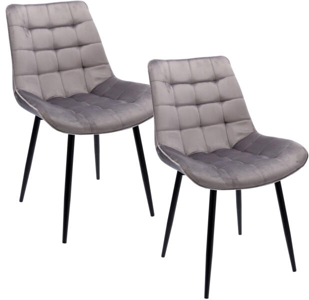 MISTY szürke szék szett (2 db) - Stílus és kényelem egyben! ?? Ez a 2 darabos MISTY szék szett tökéletes választás, ha egy kis eleganciát és komfortot szeretnél vinni otthonodba. A székek puha, bársonyos tapintású kárpitozása és a steppelt ülőfelülete igazi luxusérzetet nyújt, miközben a magas, karcsú, fekete lábak biztosítják a stabilitást és a modern megjelenést. Főbb jellemzők:Kényelmes ülőfelület: A puha, steppelt ülőfelület hosszú távon is kényelmes ülést biztosít. Elegáns design: A bársonyos kárpit és a fekete lábak kombinációja stílusos megjelenést kölcsönöz a székeknek. Stabil szerkezet: A fém lábaknak köszönhetően a székek stabilak és tartósak. Sokoldalú felhasználás: Tökéletes választás étkezőbe, nappaliba vagy akár dolgozószobába is. Termékleírás:Szín: Szürke Kárpit: Bársony (velúr) Lábak: Fém Maximális terhelhetőség: 130 kg / szék Méretek:Méret Érték (cm)Magasság 83Szélesség 53Mélység 63Ülésmagasság 42Ülésszélesség 53Ülésmélység 42Lábak közötti táv 39Fontos: A lábakat megfelelően rögzítsd a használat előtt!