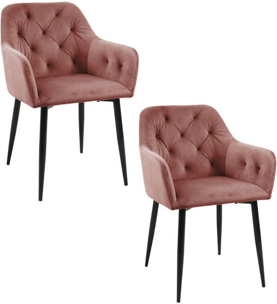 AKORD 2 db-os Púder Rózsaszín Velúr Étkezőszék Szett - Stílus és Kényelem Egyben! ? Varázsolja otthonát stílusosabbá és kényelmesebbé ezzel a gyönyörű, púder rózsaszín velúr étkezőszék szettel! Tökéletes választás étkezőbe, nappaliba, vagy akár dolgozószobába is. A modern design és a minőségi anyagok garantálják a hosszú élettartamot és a kifinomult megjelenést. Főbb jellemzők:Kényelmes Velúr Kárpitozás: A puha velúr anyag kellemes tapintású és komfortos ülést biztosít, akár hosszabb ideig is. Elegáns Steppelt Design: A steppelt kárpitozás időtlen eleganciát kölcsönöz a székeknek, feldobva bármelyik helyiséget. Erős Fém Lábak: A fekete színű fémlábak stabil alapot biztosítanak és jól illeszkednek a klasszikus és modern stílusú enteriőrökhöz egyaránt. Sokoldalú Felhasználás: Ideális étkezőbe, nappaliba, dolgozószobába vagy akár váróterembe is. Termékjellemzők:Szín: Púder rózsaszín Anyag: Velúr kárpitozás, acél lábak Láb színe: Fekete Méretek: Ülésszélesség: 41 cm Ülésmélység: 41 cm Ülésmagasság: 49 cm Szék magassága: 81 cm Szék szélessége: 55 cm Szék mélysége: 58,5 cmMaximális terhelhetőség: 125 kg Súly: 13,95 kg (szék) Székek száma a készletben: 2 Láb típusa: Egyenes Csomagolási információk:Csomagok száma: 1 Csomag mérete: 73 x 54 x 56 cm Összeszerelés: A székek összeszerelést igényelnek.