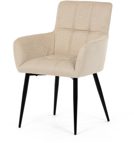 Az Autronic elegáns krémszínű étkezőszéke tökéletesen kiegészíti a modern és a klasszikus belső tereket. Ez a stílusos szék kiváló kényelmet biztosít kiváló minőségű szövetkárpitjának és puha PU hab ülésének köszönhetően. A fekete fém lábak stabilitást biztosítanak, és finom ipari hatást adnak a széknek. Minden alkalommal értékelni fogja a kényelmes karfákat és az ergonomikus kialakítást, amikor ül. A székek nem csak otthoni étkezőbe, hanem éttermi terekbe is alkalmasak, ahol meghitt hangulatot teremtenek.