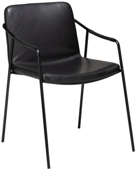 A DAN-FORM Boto design étkezőszék első pillantásra megragadja a tekintetet a retró stílus könnyed beütésével. A vékony, fekete lakkozott talp minimálisan kapcsolódik a karfákhoz. Az ülés elegáns, fekete színű ökobőrből készült, akárcsak a háttámla. A stílusos bónusz egy ugyanebből az anyagból készült szélesebb csík, amely a kartámaszok köré tekeredik.