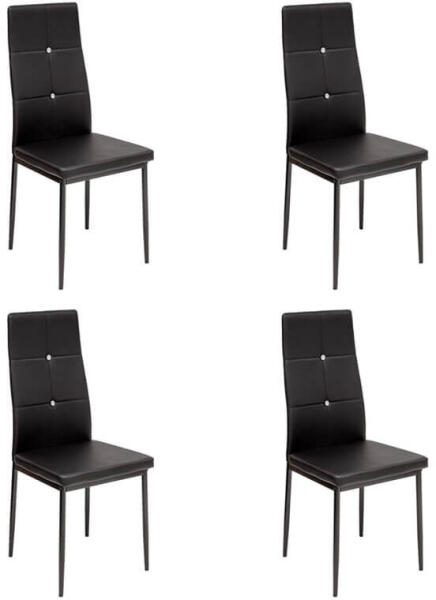 Elvira Fekete Műbőr Szék Szett (4 db) - Elegáns és Kényelmes Étkezőszék ? Varázsoljon stílust és eleganciát otthonába az Elvira fekete műbőr székekkel! Ez a 4 darabos szett nem csak a konyhában mutat jól, hanem irodákban, várótermekben vagy éttermekben is remekül mutat. A gyémánt hatású díszítés luxus megjelenést kölcsönöz a székeknek, vonzva a vendégeket és a családtagokat egyaránt. Főbb előnyök: ✨ Elegáns dizájn csillogó gombokkal ? Párnázott ülőke és háttámla a maximális kényelemért ? Tartós műbőr a hosszú élettartamért ⚖️ Alacsony tömeg, nagy teherbírás a könnyű mozgathatóságért és a stabilitásért ? Könnyen tisztítható felület a praktikus használatért ?️ PVC dugókkal rögzített széklábak a padló karcolódásának megakadályozására ?️ Gyors és egyszerű összeszerelésTovábbi jellemzők:Szín: Fekete Csomag tartalma: 4 db szék Az Elvira székek nem csak szépek, de rendkívül kényelmesek is. A párnázott ülőke és háttámla biztosítja a komfortos ülést, míg a tartós műbőr könnyű tisztíthatóságot garantál. A székek stabilak és tartósak, így hosszú távon is élvezheti a használatukat. A PVC dugókkal ellátott lábak védik a padlót a karcolásoktól, így nem kell aggódnia a sérülések miatt. Az Elvira székekkel garantált a stílusos és kényelmes étkezés vagy munkavégzés! ?️