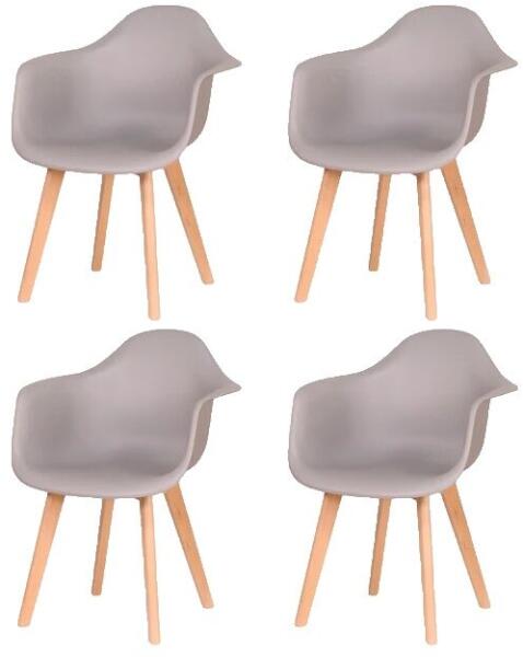 Modern szürke étkezőszék szett - 4 darabos ? Élvezze a kényelmet és a stílust ezzel a minimalista designnal rendelkező étkezőszék szettel, amely tökéletes választás otthonába vagy irodájába! Főbb jellemzők:Ergonomikus kialakítás: Optimális kényelmet és megtámasztást biztosít a hátnak és a karoknak. Könnyű összeszerelés: A mellékelt útmutató és csavarok segítségével gyorsan és egyszerűen összeszerelhető. Padlóvédelem: A bükkfa lábak padlóvédővel vannak ellátva, így óvják a padlót a karcolásoktól és csökkentik a zajt. Kiváló minőségű anyagok: A polipropilén ülőfelület tartós és könnyen tisztítható, a bükkfa lábak pedig stabilitást biztosítanak. Sokoldalú stílus: A modern design bármilyen helyiségbe jól illeszkedik, legyen szó étkezőről, konyháról, nappaliról vagy irodáról. Műszaki adatok:Jellemző ÉrtékSzín SzürkeTípus Fotel székStílus Minimalista, Retro, ModernAnyag Polipropilén, BükkfaMéretek 43 x 41 x 82 cmMennyiség 4 darab/szettA csomag tartalma: 4 db szürke étkezőszék