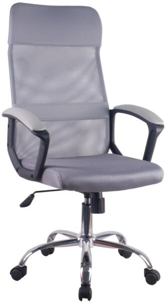 Szobák > Konyhabútor, étkezőbútor > Étkezőszék - Magas háttámlájú irodai szék, szürke színben kapható.  A szék forgatható, magasságban állítható, és pillangómechanizmussal van felszerelve az ülés dőlésszögének beállításához. Az ülés és a háttámla a fejtámláig hálós kárpitozással van ellátva, amely lehetővé teszi a légáramlást. A szék ülőfelülete 46 cm széles és 48 cm mély.  A karfák párnázottak és fixek. Az alap krómozott és öt fekete dupla görgővel van felszerelve. A szék maximális teherbírása 100 kg.