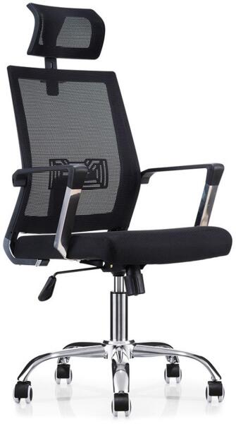 Szobák > Konyhabútor, étkezőbútor > Étkezőszék - Kényelmes és modern irodai szék fekete színben. Az ülés minőségi szövettel kárpitozott, a háttámla és a fejtámla hálós anyagból készült. A fejtámla magassága állítható. A szék pillangómechanizmussal rendelkezik. Forgatható és magasságban is állítható. A fekete váz műanyagból készült. A fix karfák műanyagból és rozsdamentes acélból készültek. Az ülőfelület habszivacs belsővel rendelkezik. A lábazat krómozott és 5 fehér PU görgővel rendelkezik. Max. teherbírás 110 kg.