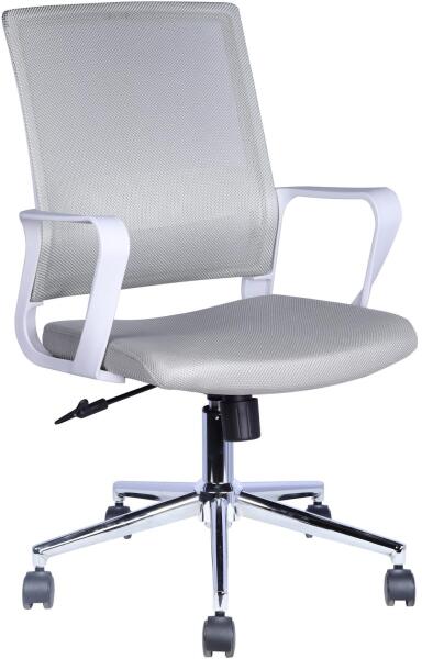 Szobák > Konyhabútor, étkezőbútor > Étkezőszék - Irodai szék, fehér vázzal és többféle színű kárpitozással. A szék forgatható és magasságban állítható. A háttámla és az ülőlap hálós anyaggal van kárpitozva, amely lehetővé teszi a légáramlást. A karfák fixek és a háttámlával egybeépítettek. A krómozott váz öt fekete gumírozott görgővel van felszerelve. A szék maximális teherbírása 90 kg.