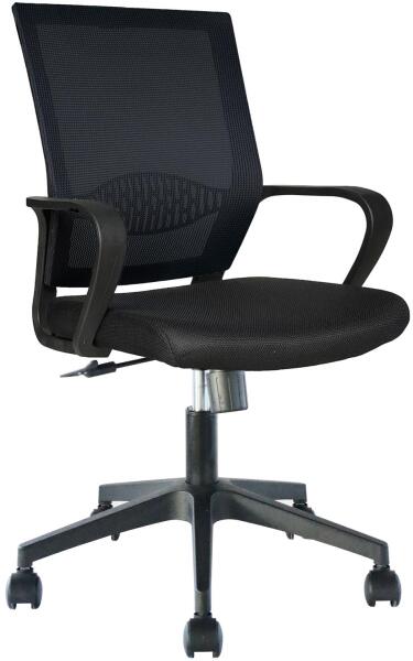 Szobák > Konyhabútor, étkezőbútor > Étkezőszék - Praktikus irodai szék, teljesen fekete színben és ergonomikus háttámlával. A szék 360°-ban forgatható és magassága gázmechanizmussal állítható a tartóoszlopban. Hálós kárpitozással van ellátva, amely lehetővé teszi a friss levegő áramlását. A karfák fixek. A szék alapja tartós nejlonból készült.