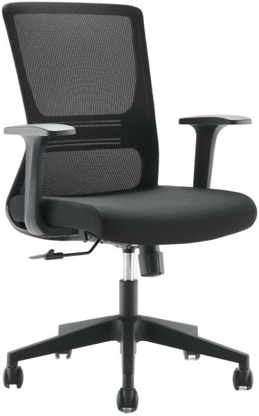 Szobák > Konyhabútor, étkezőbútor > Étkezőszék - Modern irodai szék teljesen fekete színben, ergonomikus háttámlával és fix karfákkal. A szék forgatható és magasságban állítható. Az ülés szövettel, a háttámla pedig minőségi hálóval kárpitozott, amely lehetővé teszi a légáramlást. Az ülés nagy sűrűségű habbal van töltve a fokozott kényelem érdekében. A szék pillangómechanizmussal is rendelkezik a dőlésszög beállításához. A fekete lábazat polipropilénből készült és 5 nejlon kerékkel rendelkezik. Az irodai szék maximális teherbírása 100 kg.