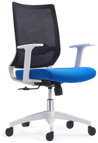 Egyszerű irodai szék, minőségi hálós anyaggal kárpitozva. A szék fekete és kék színkombinációban kapható. Forgatható és magasságban állítható. Az ülés belsejében habszivacs található. A váz és a fix karfák fehér színűek és műanyagból készültek. A szék egy pozícióba állítható billenőmechanizmussal rendelkezik. A fehér műanyag váz 5 fekete PU görgővel rendelkezik. Max. teherbírása 110 kg.  - Mindigbútor