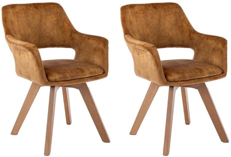 Praktikus étkezőszék karfákkal. Az ülőfelület, a háttámla és a karfák puha szövettel kárpitozottak, és több színben kapható. A szék váza és alapja tömör bükkfából készült, tölgyfa színűre festve. Az ülőfelület 44 cm széles és 41 cm mély. Magassága 45 cm. Az alap beépített forgótányérral rendelkezik, amely lehetővé teszi a szék ülőfelületének 360°-os elforgatását. Maximális teherbírás 120 kg.  - Mindigbútor