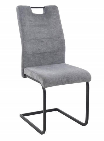 Elegáns étkezőszék, amely stilizált dizájnjával feldobja otthonát. A szék minőségi, szürke színű szövettel van kárpitozva. Az ülőfelület 4 cm vastag a kényelmes ülés érdekében. Az alap 15x25 mm méretű fémcsövekből készült, és fekete színű porfestett. A szék talpára kis, lekerekített lábvédők vannak felszerelve. A szék maximális teherbírása 120 kg.