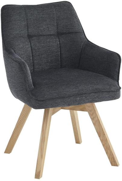 Szobák > Konyhabútor, étkezőbútor > Étkezőszék - Kényelmes étkezőszék karfákkal és forgófunkcióval. A teljes szék puha szövettel kárpitozott, antracit vagy zöld színben kapható, és a háttámla mentén díszvarrással van ellátva. Az ülőfelület tölgyfából készült, az eredeti fa színben. Az ülőfelület forgótányérja lehetővé teszi, hogy a szék ülőfelülete 180°-ban elforduljon. Akár az asztalon lévő valami után nyúl, akár beszélget, akár az ülőpozícióját állítja be, ez a hasznos funkció új szintre emeli a funkcionalitást a stílus feláldozása nélkül. A szék maximális teherbírása 120 kg.