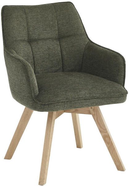 Kényelmes étkezőszék karfákkal és forgófunkcióval. A teljes szék puha szövettel kárpitozott, antracit vagy zöld színben kapható, és a háttámla mentén díszvarrással van ellátva. Az ülőfelület tölgyfából készült, az eredeti fa színben. Az ülőfelület forgótányérja lehetővé teszi, hogy a szék ülőfelülete 180°-ban elforduljon. Akár az asztalon lévő valami után nyúl, akár beszélget, akár az ülőpozícióját állítja be, ez a hasznos funkció új szintre emeli a funkcionalitást a stílus feláldozása nélkül. A szék maximális teherbírása 120 kg.