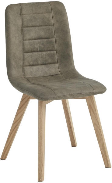 Praktikus étkezőszék, puha, bézs kárpitozással, amely modern vagy klasszikus étkezőbe egyaránt illik. A karfa nélküli kialakítás bőséges helyet kínál a különböző ülési pozíciókhoz, rugalmasságot biztosítva a felhasználónak. Ez a dizájnelem lehetővé teszi, hogy a szék könnyen elférjen a legtöbb étkezőasztal alatt, maximalizálva a helykihasználást. A szék háttámláját középen vízszintes és függőleges díszvarrás díszíti. A varrások fokozzák a szék megjelenését, és vizuális érdekességet kölcsönöznek, ami vonzza a tekintetet. A szék masszív, négylábú alapja tölgyfából készült, természetes tónusú felületkezeléssel, hogy hangsúlyozza organikus jellegét, miközben kiváló stabilitást biztosít, így sokoldalú darab mind a hétköznapi, mind a formális étkezőbe.