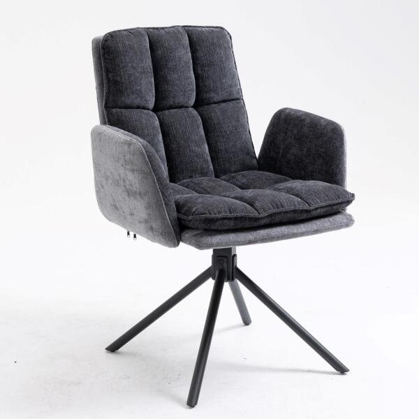 Szobák > Konyhabútor, étkezőbútor > Étkezőszék - Modern étkezőszék egyszerű dizájnnal, amely remekül mutat otthonában. A szék minőségi, semleges szürke színű szövettel kárpitozott. Az ülőfelület és a háttámla két rétegű kárpitozással rendelkezik, a külső réteg díszes varrással van steppelve a szebb megjelenés érdekében. A szék kárpitozott karfákkal is felszerelt, amelyek szükség esetén levehetők. A vastagon kárpitozott ülőfelület 44 cm mély, és a kárpitozással együtt akár 51 cm-rel is a talaj felett lehet. A háttámla 44 cm magas. A négylábú lábú lábtartó fémből készült, és fekete porfestett bevonattal rendelkezik a jobb védelem érdekében. A háttámlán beépített fogantyú található a könnyű mozgatás érdekében. A szék 180°-ban elforgatható. A szék maximális teherbírása 120 kg.