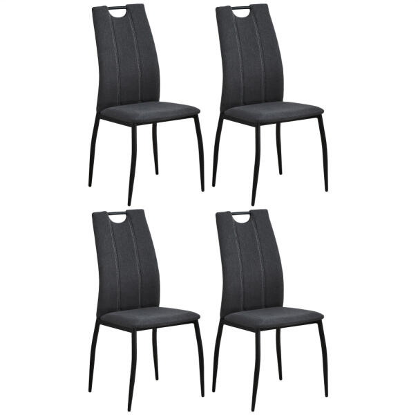 Egyszerű étkezőszék, ergonomikus háttámlával. Teljesen kárpitozott, kiváló minőségű szövettel, több szürke árnyalatban kapható. A 4 cm vastag ülőfelület kényelmes ülést biztosít, a háttámla pedig fogantyúval is rendelkezik a szék könnyű mozgatásához. Az alap ívelt fémcsövekből készült, 2,5-1,6 cm átmérőjű. A csövek matt fekete porfestékkel vannak bevonva a jobb védelem érdekében. A szék maximális teherbírása 120 kg.