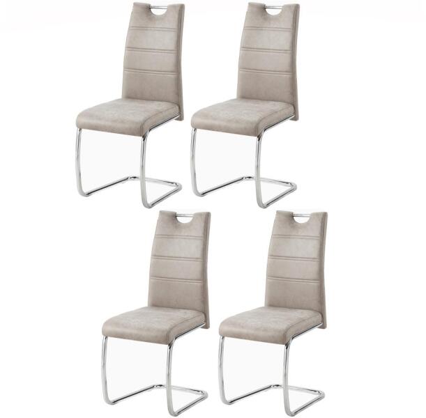 Egyszerű étkezőszék, amely teljes egészében kárpitozott, minőségi, könnyen karbantartható mikroszálas anyaggal. Az ülőfelület és a háttámla díszes öltésekkel van steppelt. A szánkó alakú lábazat fém kerek csövekből készült, krómozott felülettel. Az ülőfelület magassága 47 cm. A szék maximális teherbírása 120 kg.  - Mindigbútor