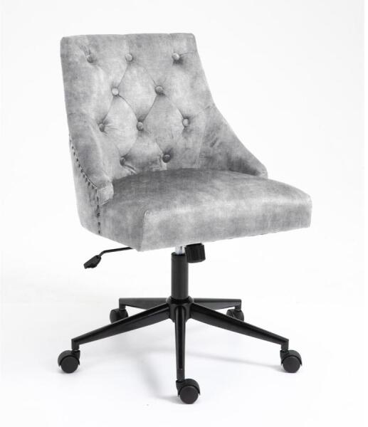 Kényelmes irodai szék, világos szürke színben. A szék forgatható és magasságban állítható. Az ülés és a háttámla vastagon kárpitozott puha szövettel, és dekoratív varratokkal steppelt, amelyek feldobják a szék megjelenését. A szék váza fémből készült, és fekete porfestékkel festett a jobb védelem érdekében. Az ötágú talp fekete poliuretán kerekekkel van felszerelve. Az irodai szék maximális teherbírása 120 kg.  - Mindigbútor