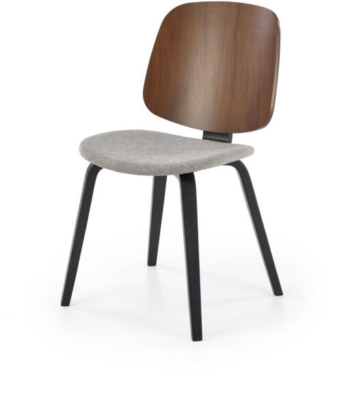 K563 szék Méretek: 54/45/81/45 cm Anyaga: tömör gumi fa / hajlított rétegelt lemez / szövet Szín: dió / szürke / fekete