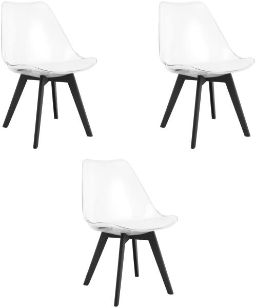 MARK Átlátszó Szék Fekete Bükkfa Lábakkal (3 darabos szett) - Stílus és Kényelem Egyben! ? Ez a 3 darabos MARK szék szett tökéletes választás otthonodba, legyen szó a nappaliról, konyháról vagy étkezőről. Az időtlen dizájn és a kiváló ergonómia kombinációja garantálja a kényelmes és stílusos ülőalkalmatosságot. Főbb jellemzők:Időtlen dizájn: Bármely enteriőrbe könnyen beilleszthető. Ergonomikus kialakítás: Hosszú távon is kényelmes ülést biztosít. Sokoldalú felhasználás: Ideális nappaliba, konyhába vagy étkezőbe. Tartós anyagok: Polipropilén ülőfelület és bükkfa lábak a hosszú élettartamért. Méretek: Szék magassága: 82 cm Szék szélessége: 49 cm Ülésmagasság: 47 cm Ülésszélesség: 44 cm Ülésmélység: 43 cm Specifikációk: Ülés anyaga: Polipropilén + eko-bőr párna Lábak: Fekete bükkfa Súly (nettó): kb. 4,35 kg / szék Szín: Átlátszó szék fekete lábakkal és fehér ülőpárnával Összeszerelés: A székek könnyen összeszerelhetők, így gyorsan élvezheted az új bútoraidat. ✨ Ez a szett nem csak praktikus, de a letisztult designjával feldobja otthonod hangulatát. A tartós anyagoknak köszönhetően hosszú éveken át megbízható társad lesz a mindennapokban.