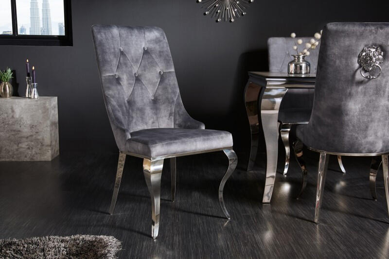 A Rococo design luxus étkezőszék tipikus angol stílust képvisel. Tökéletes választás a klasszikus dizájn kedvelőinek, elegáns és modern megjelenésű egyszerre. A Chesterfield-stílusú steppelt háttámla barokk hangulatot kölcsönöz a széknek. Kényelmes kialakítása hosszú és kényelmes ülést biztosít. A háttámla külső oldalán elhelyezett speciális, oroszlánfej alakú fém fogantyú megkönnyíti a szék kezelését. Az arany tónusú fémlábak puhább felületeken is stabilak. Harmonikus koncepciót alkot az azonos nevű sorozat kiegészítőivel. A Rococo szék minden nap szolgálni fogja Önt, és az étkező bájos részévé válik.
