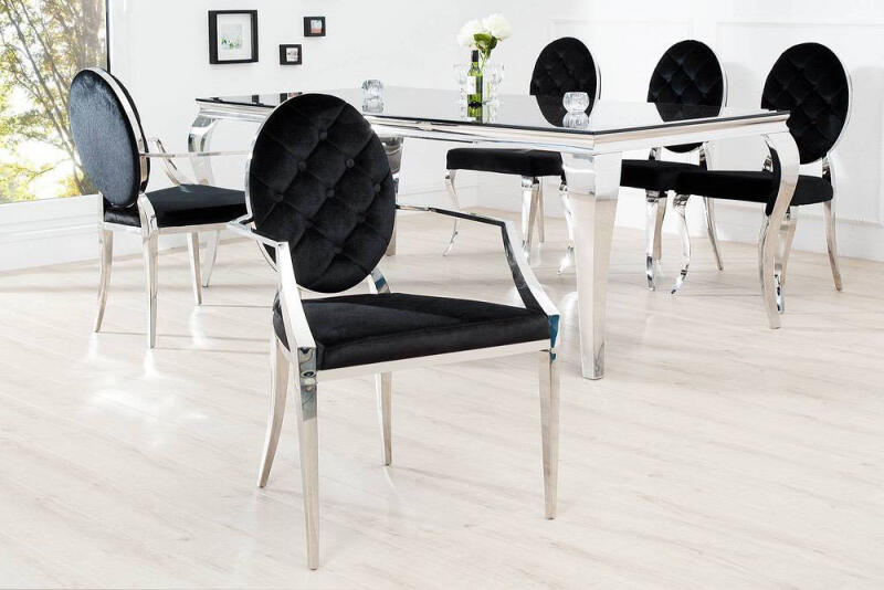 Luxus szék Rococo barokk stílusban, felkelti a figyelmet az ívelt vonalaival. Kiváló minőségű csiszolt rozsdamentes acélból és bársony anyagból készült. Ez a bútordarab azonnal felkelti a vendégei figyelmét. Adja meg a helységének a lenyűgöző karizmát ezzel a nemes dizájnnal rendelkező székkel.