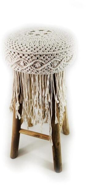 makramé csomózással díszített fa ülőke otthonod belső tereinek praktikus és a szemnek kellemes dísze lehet. Kézzel készült borítása melegséget és egy kis romantikát csempész bohém, wabi sabi, vagy trópusi stílusú nappalidba.