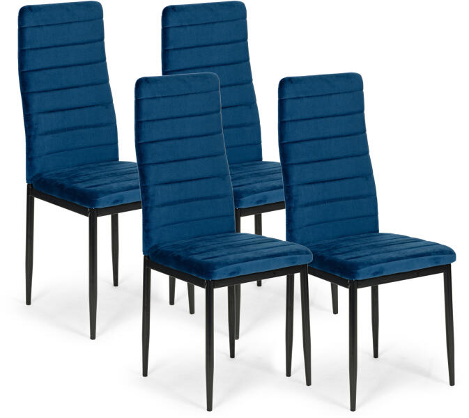 Elegáns kék bársony szék szett - 4 darabos ? Ez a 4 darabos szék szett tökéletes választás nappaliba, étkezőbe, irodába vagy akár várótermekbe is. A kék bársony kárpitozás és a kontúros háttámla elegáns és modern megjelenést kölcsönöz bármilyen térnek. Élvezze a kényelmet és a stílust egyben! Főbb jellemzők:Kényelem: A megfelelően profilozott, magas háttámla és a kiváló minőségű PU hab töltet garantálja a kényelmes ülést. Design: A kék bársony kárpitozás és a steppelés elegáns és modern megjelenést biztosít. Stabilitás: A porszórt acélból készült, egyenes, fekete lábak biztosítják a stabilitást és a tartósságot. A székek akár 120 kg-os terhelést is kibírnak. Védelem: A lábak speciális kialakításúak, így nem karcolják meg a padlót. Műszaki adatok:Jellemző ÉrtékTermékkód VELVET4BLUE4Székek száma 4Szín Kék, FeketeSzék súlya kb. 4 kgCsomagolási méret 110x42x20 cmMéretek: Magasság: 97 cm Szélesség: 40 cm Mélység: 40 cm Felhasználási területek: Étkezők Nappalik Bárok Étteremek Irodák Várótermek Ezek a székek nem csak otthoni használatra ideálisak, hanem közösségi terekben is megállják a helyüket. A minőségi anyagok és a tartós szerkezet garantálja a hosszú élettartamot és a felhasználók elégedettségét. ✨