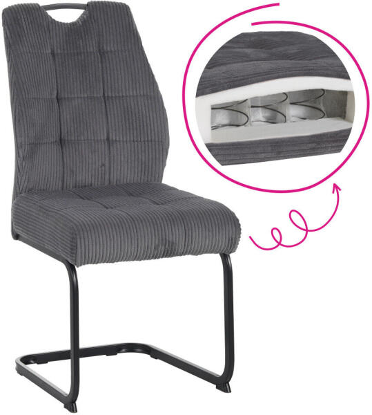 KELMA szürke/fekete étkezőszék - Stílus és kényelem egyben! ? A KELMA étkezőszék tökéletes választás modern otthonokba. A szürke szövet és a fekete fém lábak elegáns megjelenést kölcsönöznek neki, míg a rugós ülés és a puha ülőfelület maximális kényelmet biztosít. Főbb jellemzők:Szín: Szürke/fekete Anyag: Hydra 13 szövet, rugók, fém Kopásállóság: 65 000 Martindale Teherbírás: 100 kg Modern, steppelt designFogantyúval ellátva a könnyű mozgathatóságért Méretek:Méret ÉrtékSzélesség 46 cmMélység 62,5 cmMagasság 97 cmÜlésmagasság 49 cmÜlésmélység 46 cmÜlésszélesség 46 cmHáttámla szélessége 46 cmHáttámla magassága 48 cmTovábbi információk:Puha ülőrésszel a hosszan tartó kényelemért. Rugós ülés a még komfortosabb ülésélményért. Szétszerelve szállítjuk, de könnyen összeszerelhető. Ez a szék nem csak jól néz ki, de rendkívül kényelmes is, így a vacsorák és a baráti összejövetelek még élvezetesebbek lesznek! ✨