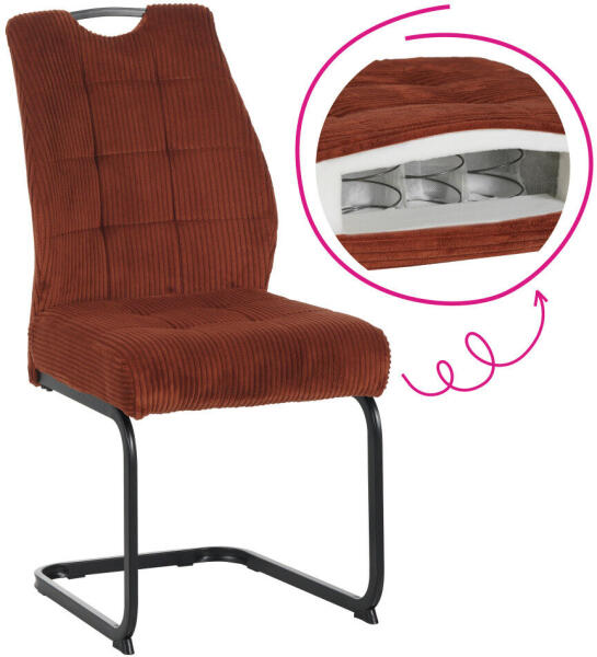 KELMA terrakotta és fekete étkezőszék: Stílus és kényelem egyben! ? A KELMA étkezőszék tökéletes választás, ha modern és kényelmes ülőalkalmatosságot keresel étkeződbe. A terrakotta színű szövet és a fekete fém lábak elegáns megjelenést kölcsönöznek, míg a puha ülőfelület és a rugós ülés gondoskodik a maximális komfortról. Főbb jellemzők:Anyag: Minőségi Hydra 44 szövet, rugók és erős fém váz Szín: Divatos terrakotta és fekete kombináció Méretek: Szélesség: 46 cm Mélység: 62,5 cm Magasság: 97 cm Ülésmagasság: 49 cm Ülésmélység: 46 cm Ülésszélesség: 46 cm Háttámla szélessége: 46 cm Háttámla magassága: 48 cmKényelem: Puha ülőfelület a kellemes ülésélményért Rugós ülés a még nagyobb komfortért Fogantyú a könnyű mozgathatóságértTartósság: A szövet kopásállósága a Martindale teszt szerint 65 000 kopás Teherbírás: 100 kg Design: Modern, steppelt kialakítás További információk: A szék szétszerelve kerül szállításra. Ez a szék nem csak jól néz ki, de rendkívül kényelmes is, így a hosszabb étkezések sem fognak problémát okozni. A steppelt design pedig igazán egyedi megjelenést biztosít. ✨