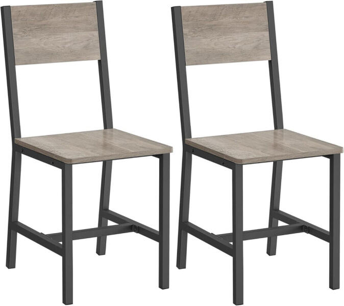 VASAGLE Matt Szürke Étkezőszék Szett (2 db): Stílus és Kényelem Egyben! ? Dobd fel étkeződet ezzel a stílusos és kényelmes VASAGLE étkezőszék szettel! A matt szürke szín és az ipari design tökéletesen illeszkedik bármilyen modern otthonba. Élvezd a kellemes étkezéseket és a kényelmes ülést! Főbb előnyök:Stílusos design: A heather greige színű fa és a matt szürke acélkeret elegáns megjelenést kölcsönöz. Ergonomikus kényelem: A 102°-os háttámla dőlésszög tökéletes tartást biztosít a hátadnak, így hosszan is kényelmesen ülhetsz. Stabil és tartós: A masszív acélváz és a minőségi forgácslap garantálja a hosszú élettartamot és a biztonságos használatot. A székek teherbírása 100 kg. Könnyű összeszerelés: A számozott alkatrészeknek és a részletes útmutatónak köszönhetően pillanatok alatt összeszerelheted a székeket. Praktikus: Vacsora után egyszerűen betolhatod az asztal alá, így helyet takaríthatsz meg. Műszaki adatok:Jellemző ÉrtékSzín Heather Greige, matt szürkeAnyag Forgácslap, AcélSzék méretei 36 x 46,6 x 87,1 cmÜlés méretei 36 x 39,2 x 1,5 cmÜlésmagasság 45,4 cmSzett súlya 12 kgMax. terhelhetőség 100 kgA csomag tartalma: 2 x Étkezőszék 1 x Kiegészítő táska (csavarok, stb. ) 1 x Útmutató Élvezd a stílusos és kényelmes étkezéseket a VASAGLE étkezőszékekkel! ✨
