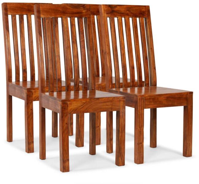 A szett négy széket tartalmaz, melyek tömör akácfából készültek, és paliszander (sheesham) felületet kaptak, így időtálló kiegészítői lesznek otthonának. A szín- és erezetbeli eltéréseknek köszönhetően a bútordarabok egyedi karakterrel bírnak. A székek tömör akácfából készültek. Az akác egy tartós trópusi keményfa. Ezek a székek teljes mértékben kézzel készültek, és a fa gyönyörű erezetének köszönhetően minden darab kissé különbözik a többitől. Az étkezőszékek nedves ruhával könnyen tisztíthatók. Könnyen összeszerelhető Fontos megjegyzés: A szín minden darab esetében eltérő, így minden bútor egyedi. A kiszállítás véletlenszerűen történik, biztosítva terméke exkluzivitását és egyediségét. A szállítás 4 étkezőszéket tartalmaz.