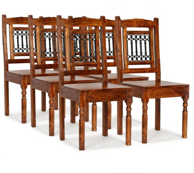 Ez a klasszikus megjelenésű szett hat széket tartalmaz, melyek gyönyörű, öntöttvas díszítésekkel lettek ellátva, és elegánssá teszik otthonát. A székek tömör akácfából készültek, és paliszander felülkezelést kaptak. Az akácfa egy tartós trópusi keményfa. A székek teljes egészében kézzel készültek, a fa gyönyörű erezetének köszönhetően pedig minden bútordarab egyedi megjelenéssel bír, és kissé eltér a többitől. Az étkezőszékek egy nedves ronggyal könnyedén tisztíthatók. Könnyen összeszerelhetőek. Figyelem: A bútor színe darabonként változhat, így minden bútordarab egyedi. A kiszállítás véletlenszerűen történik, és 6 étkezőszéket tartalmaz.