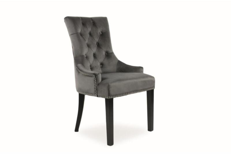 EDWARD szék szürke TAP. 72 Étkezőszék fekete fa lábakkal, szürke bársonyszövetes ülőfelülettel. Behúzott háttámla, szegecses és egyedi díszítés a hátulján. Méretek:99 cm 51 cm 55 cm 55 cm
