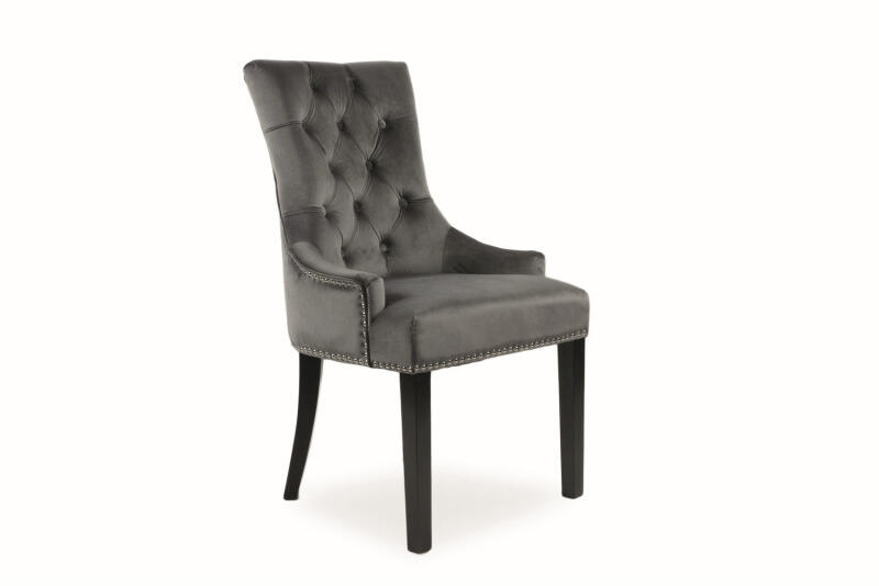 EDWARD szék szürke TAP. 72 Étkezőszék fekete fa lábakkal, szürke bársonyszövetes ülőfelülettel. Behúzott háttámla, szegecses és egyedi díszítés a hátulján. Méretek: 99 cm51 cm55 cm55 cm
